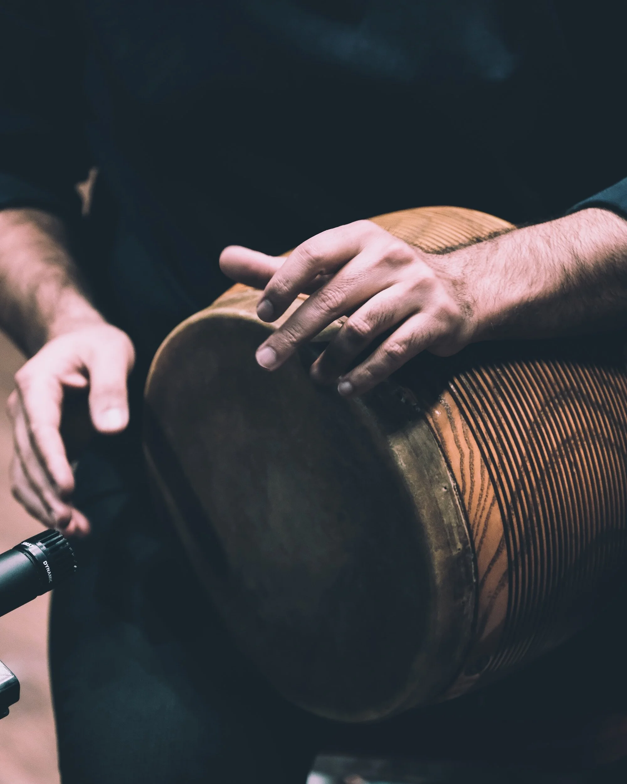 Percussion can happen anywhere — on the body, with the hands, the fingers or feet, on household objects or the earth. I can provide musical percussive instruments if desired.